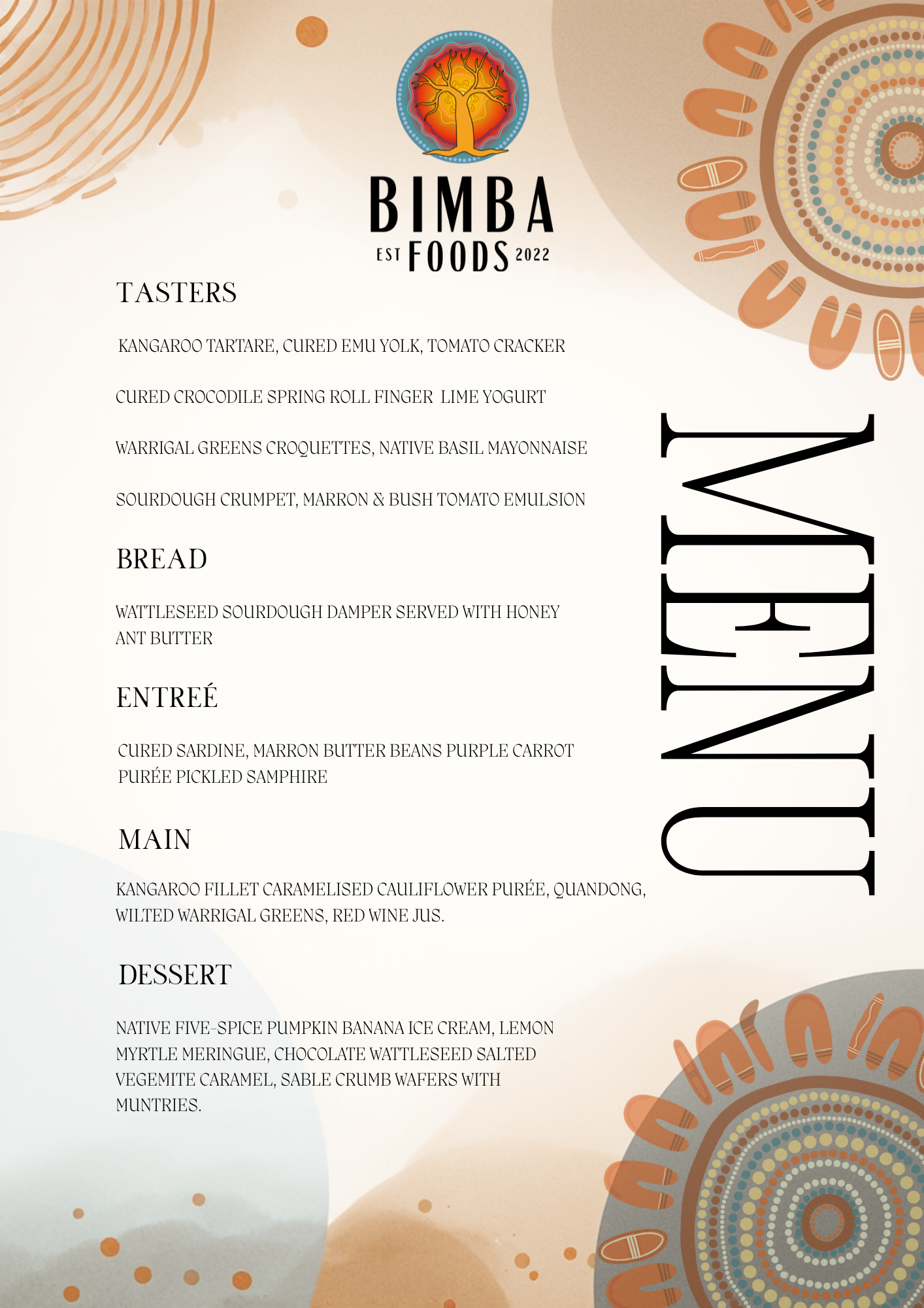 "At Bimba foods I Intertwine traditional bush foods, aboriginal art and storytelling with contemporary culinary techniques. Each dish is more than just food - it's a narrative - a connection to the land, culture and history of our people. My aim is to offer a unique dining experience that not only delights the palate but also educates and inspires" - Daniel Lyndon - Chef and Owner - Bimba Foods.